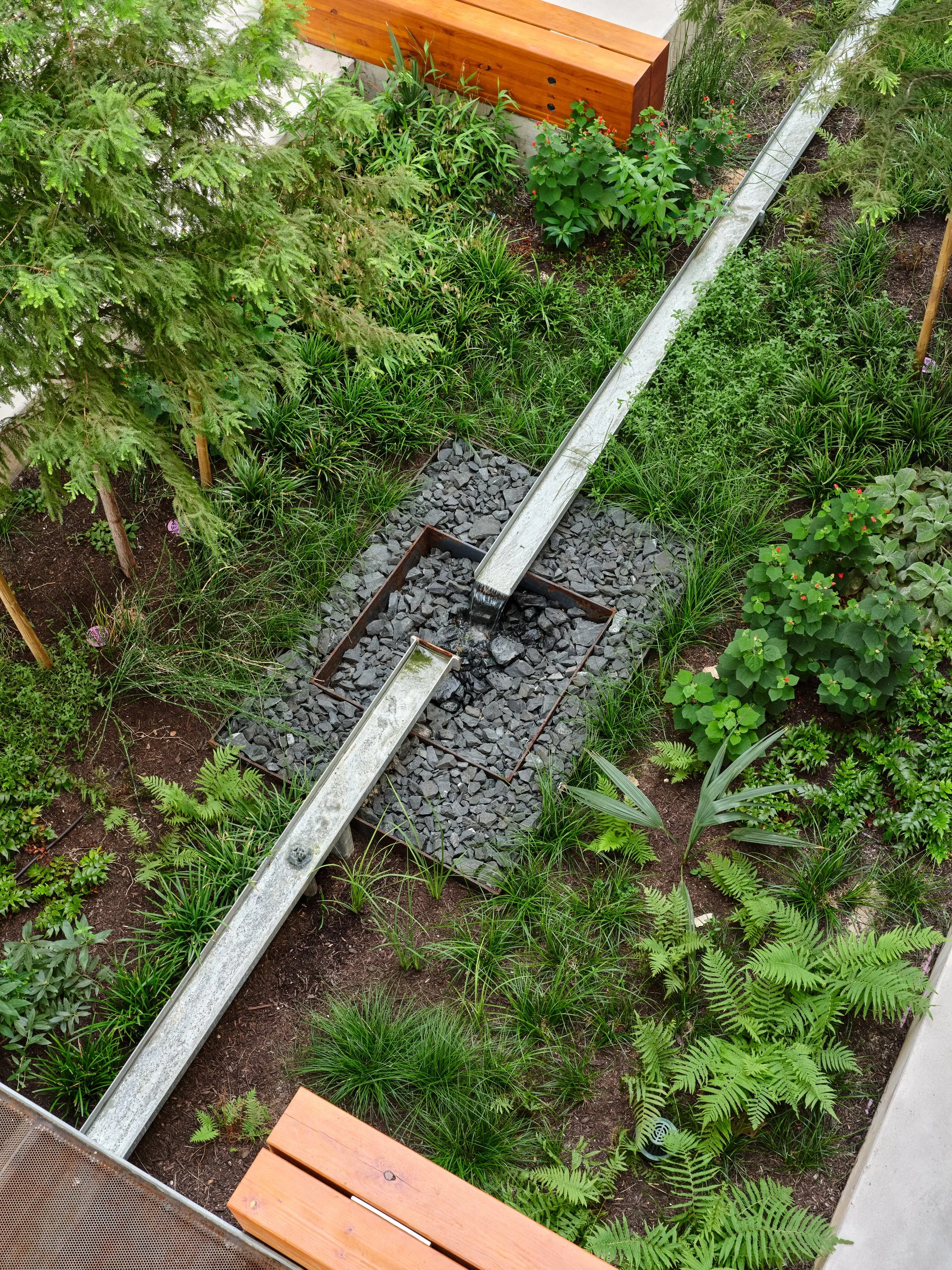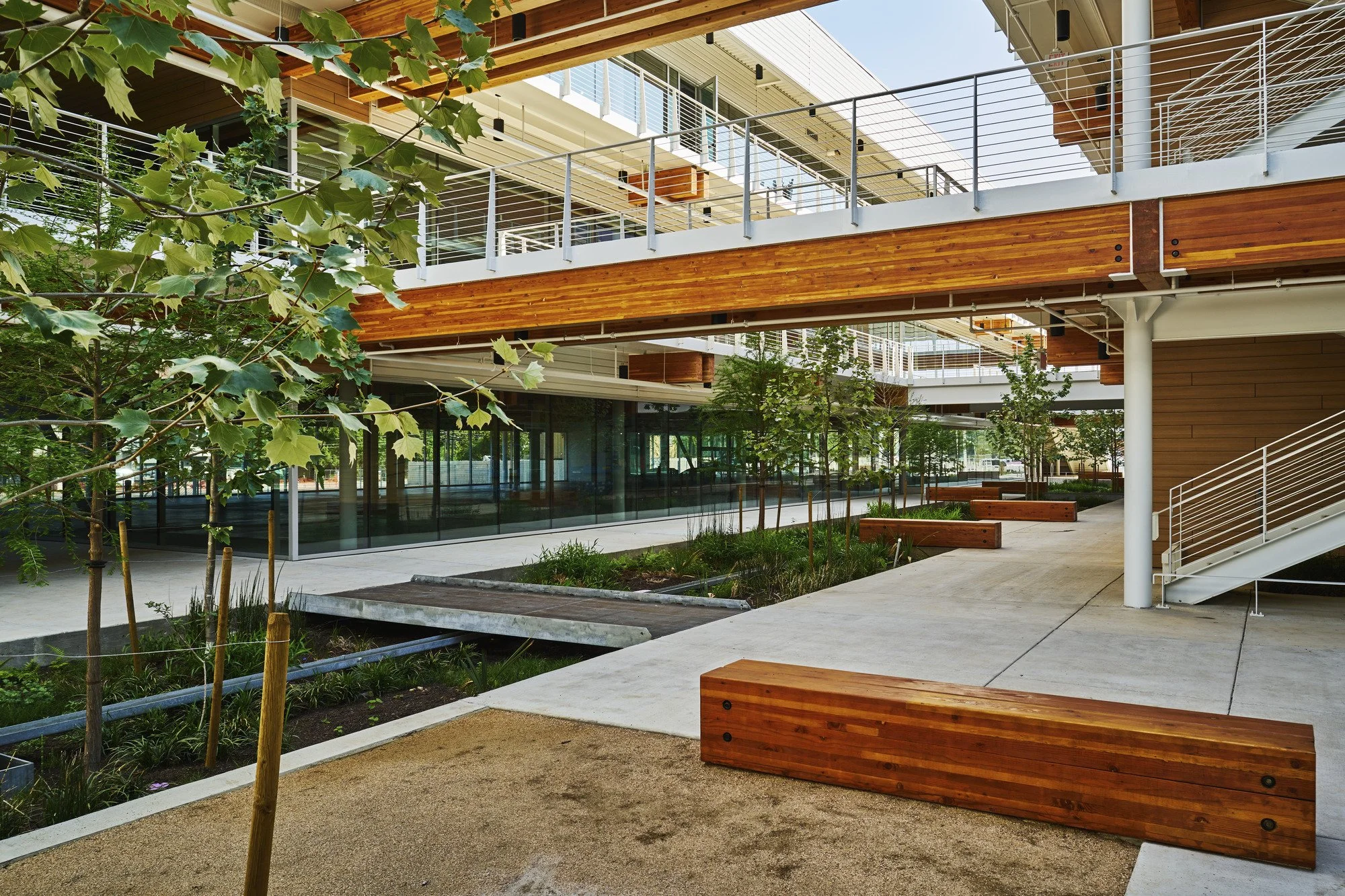 The courtyard includes elements such as a fountain and water runnel that recirculates collected stormwater and uses it for landscaping irrigation. Large sycamore trees create ample shading with the open volume providing cooling breezes. The solar array on the roof, which continues onto the open trellis shading the entry plaza, can generate nearly enough power to almost offset all energy costs.