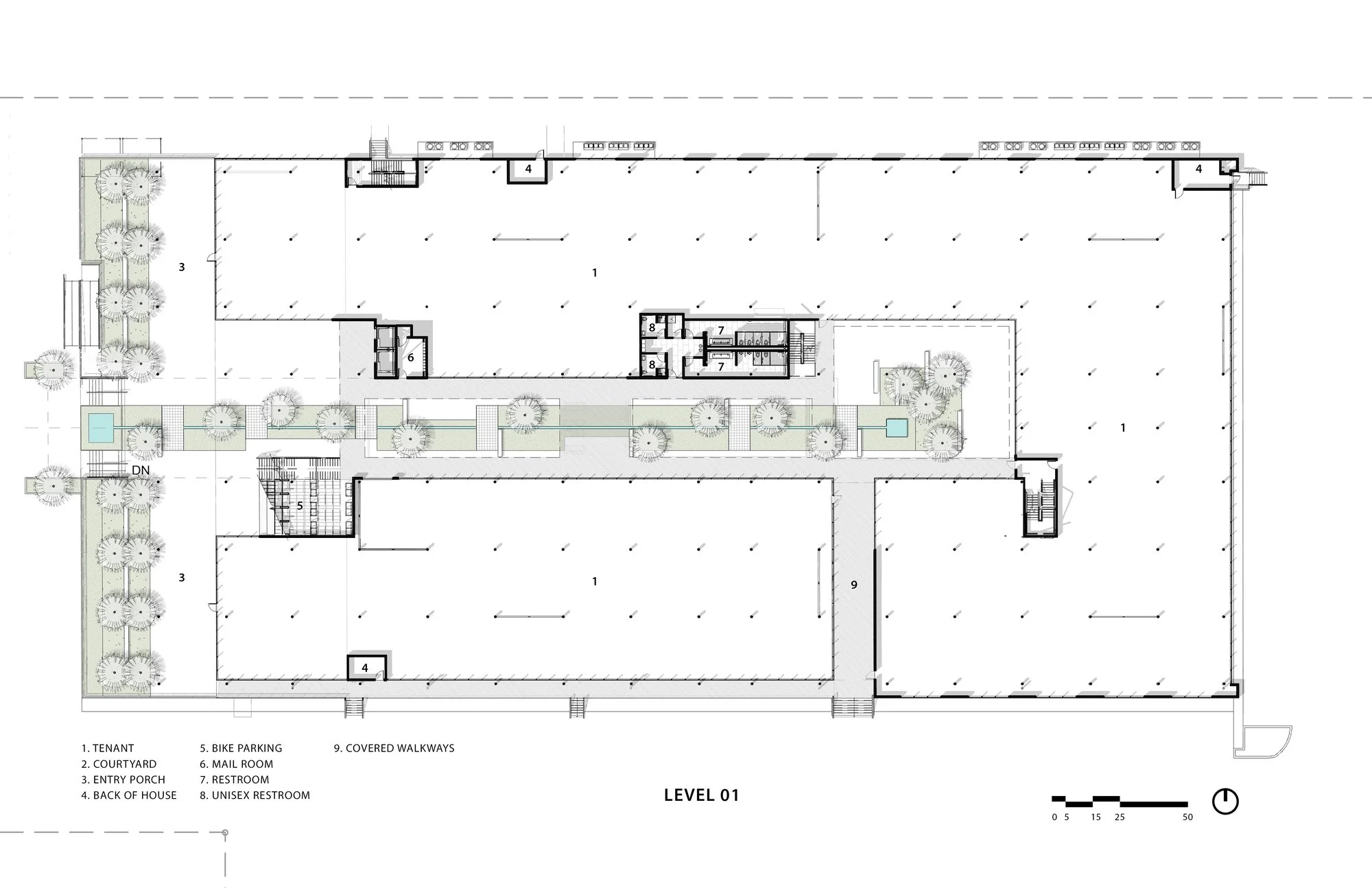 To mitigate the intense summer heat and bring light into the center of the 60,000 sf floor plate, the design carved out a central courtyard. This space would serve as a light well and exterior respite for building inhabitants. All circulation would be exterior within the courtyard, opening up to a massive solar plaza on the south end of the building, inviting the public into the space and forming a connection to the community.